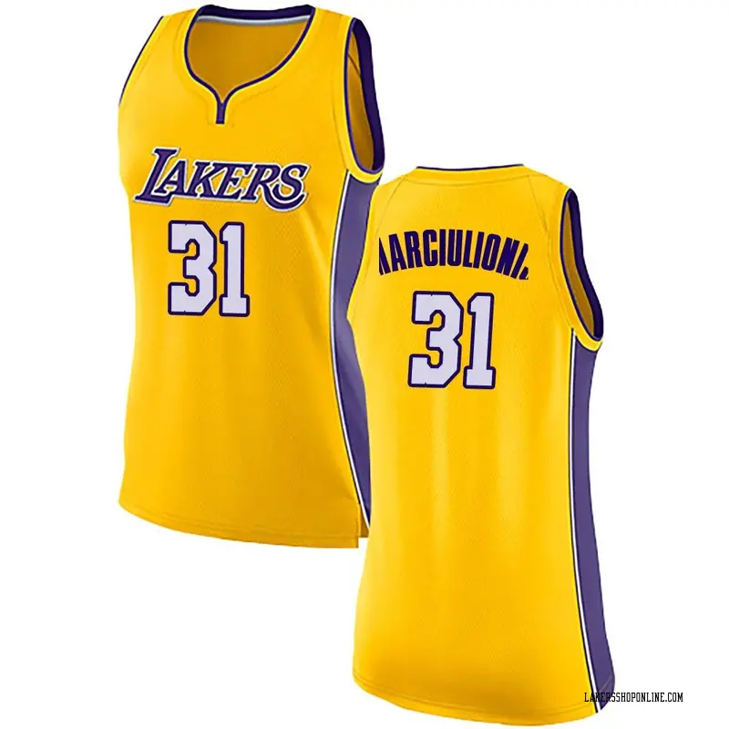 Get the perfect look to let everyone know you are a big Los Angeles Lakers fan! This Los Angeles Lakers Swingman Yellow Augustas Marciulionis Jersey - Icon Edition - Women's is ideal for wearing out and showing off your passion for the Los Angeles Lakers. It features authentic team colors and a unique design with Los Angeles Lakers and Augustas Marciulionis graphics that will make you the envy of all your favorite team's faithful!